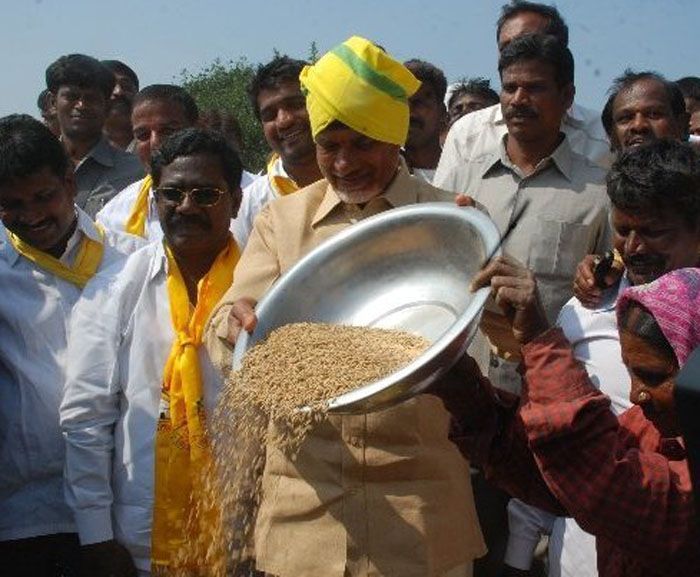 TDP president N.Chandrababu Naidu helping a woman cleaning paddy during his padayatra in Chevella of RR district on Friday.