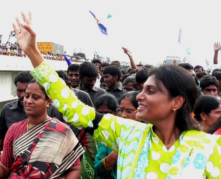 Sharmila greets people gathered to welcome her into Telanagana at Pullur in Mahbubnagar district during Maro Praja Prasthanam Padayatra on Thursday.