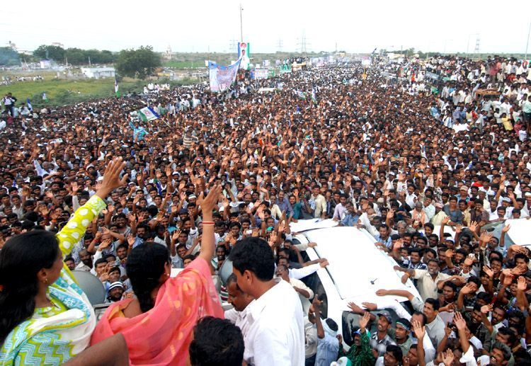 Sharmila and Vijayamm greets people gathered to welcome her into Telanagana at Pullur in Mahbubnagar district during Maro Praja Prasthanam Padayatra on Thursday.