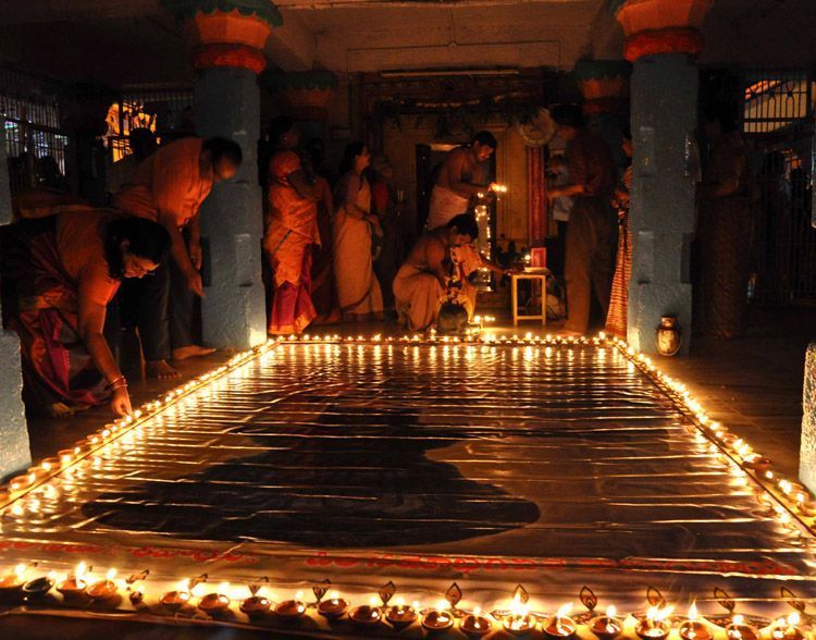Devotees lighting Kartika Deepam in Uma Maheshwara Temple at Rakshapuram in the Old City on the occasion of Kartika Pournima here on Wednesday - INN Photos