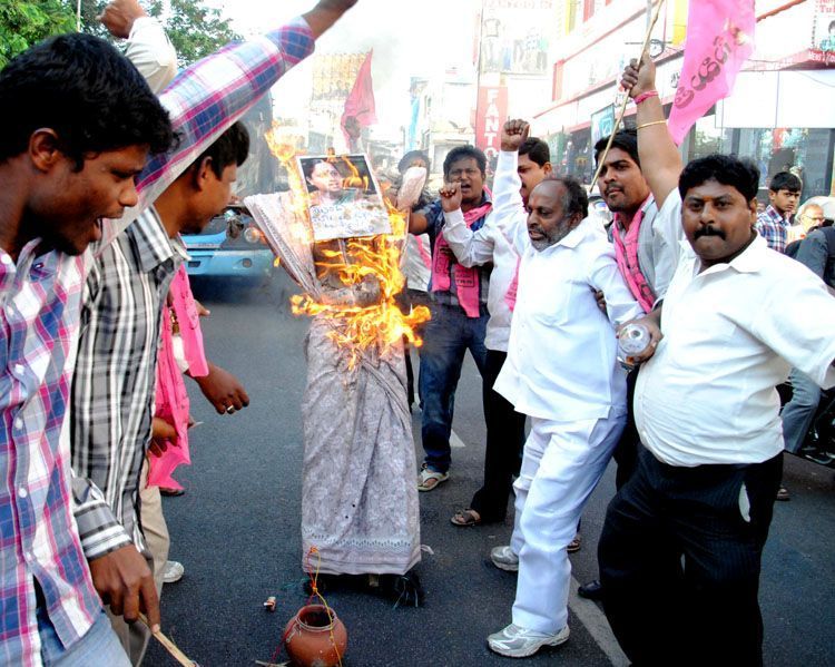 TRS activists burn the effigy of YSRCP leader Konda Surekha at Abids here on Tuesday - INN Photos