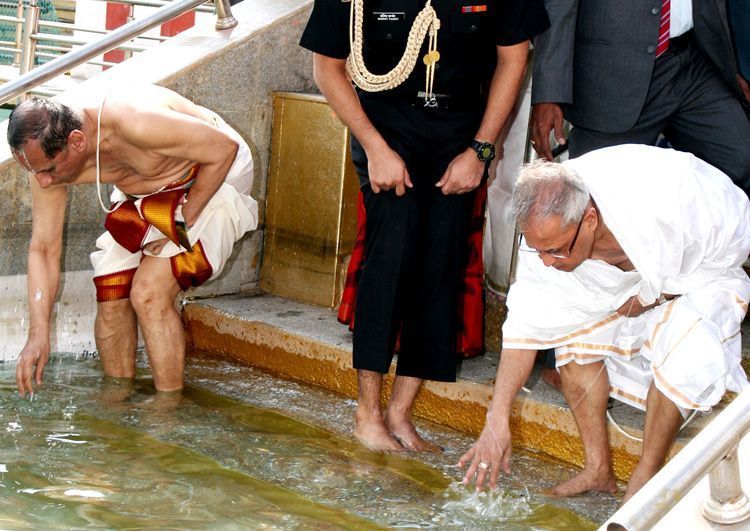 President of India Pranab Mukherjee offered prayers in the world renowned famous hindu shrine of Lord Venkateswara at Tirumala on Thursday. Governor ESL Narasimhan and Chief Minister N.Kiran Kumar Reddy escorted him to the sanctum sanctorum.