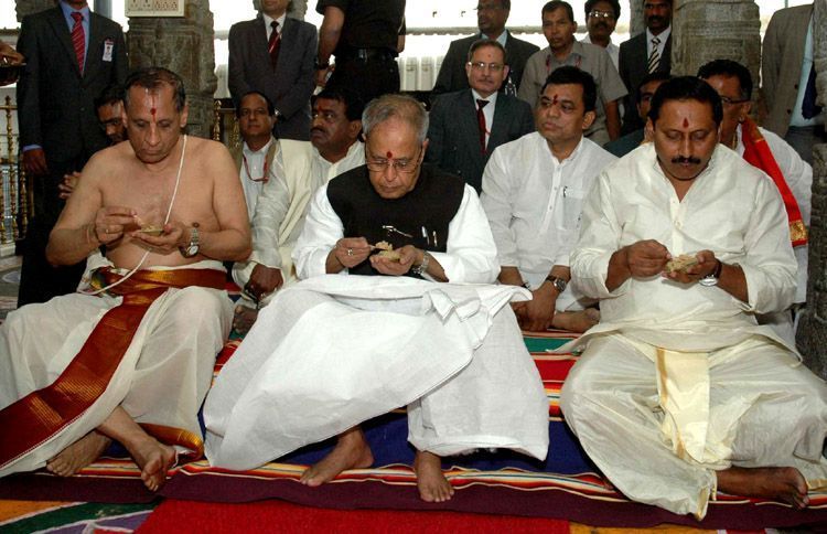 President of India Pranab Mukherjee offered prayers in the world renowned famous hindu shrine of Lord Venkateswara at Tirumala on Thursday. Governor ESL Narasimhan and Chief Minister N.Kiran Kumar Reddy escorted him to the sanctum sanctorum.