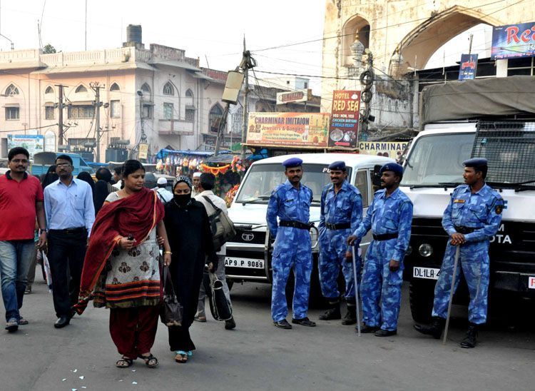 Security personnel take over the streets of Old City after closing the shops and establishments after the arrest of MIM leader Akbaruddin Owaisi here on Tuesday - INN Photos