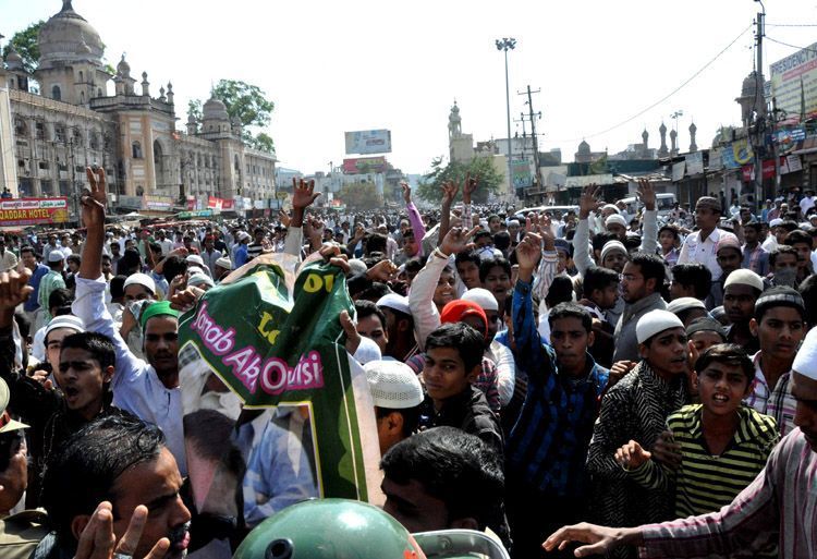 Police foil protest rally demanding release of arrested MIM leader Akbaruddi Owaisi at Mecca Masjid after Friday prayers. Police resorts to tear gas and lathi charge to dispell the mob which rained stones on police and nearby shops - INN Photos