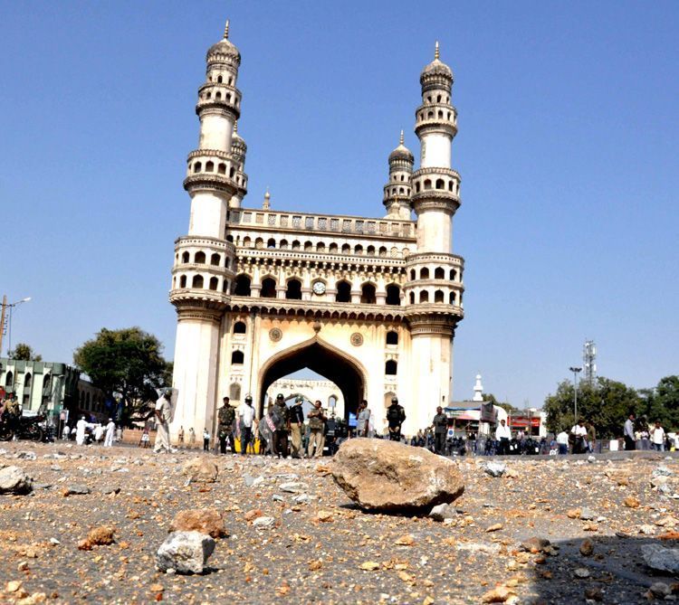Police foil protest rally demanding release of arrested MIM leader Akbaruddi Owaisi at Mecca Masjid after Friday prayers. Police resorts to tear gas and lathi charge to dispell the mob which rained stones on police and nearby shops - INN Photos