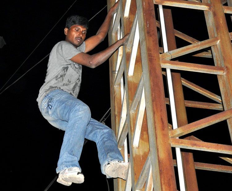 A Telangana supporter climbs up a tower at Koti threatening to commit suicide while demanding immediate announcement of formation of Telangana here on Thursday - INN Photos