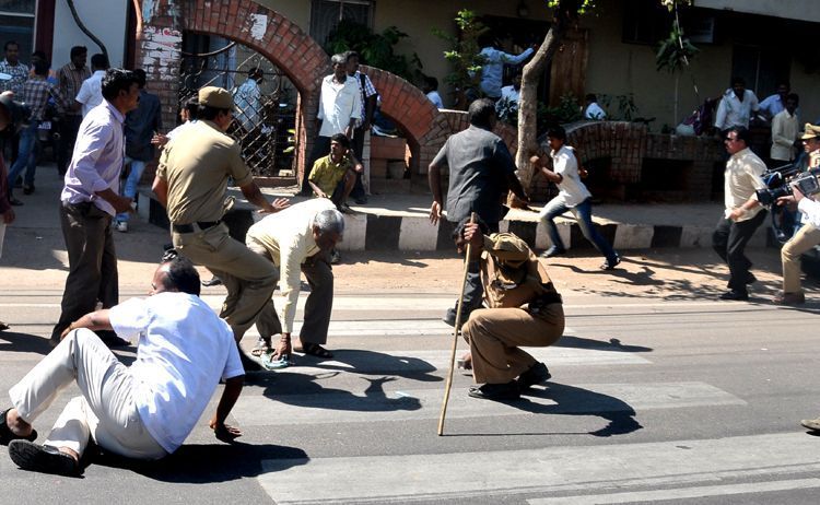 Police trying to chase away T activists for attempting to foil the Congress Seemandhra leaders meet Ministers' Quarters here on Thursday.