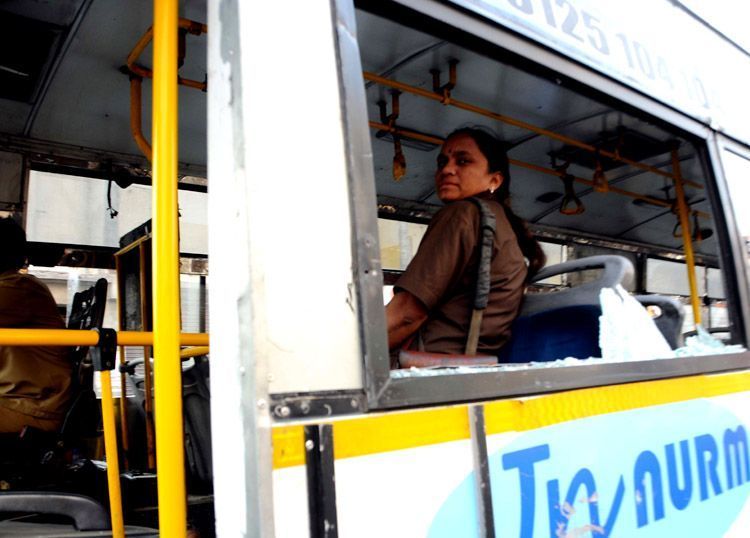 MIM workers damage the glass panes of RTC buses and some shops at Masab Tank here on Monday - INN Photos