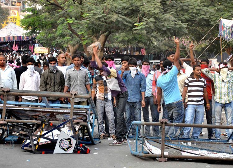 Pro-Telangana activists demolishing barricades set up by police in view of Samara Deeksha near Indira Park here on Monday - INN Photos