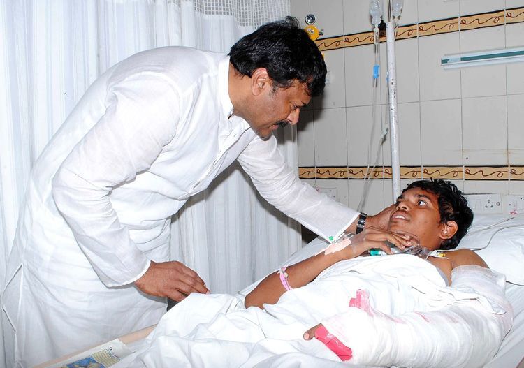 Union Minister Chiranjeevi visits blast victims at Care hospital on Friday.
