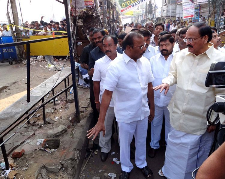 BJP senior leader M Venkaiah Naidu visiting the twin bomb blasts site in Dilsukhnagar on Saturday.