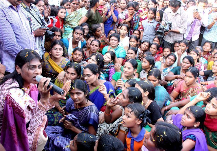 YS Sharmila of YSR Congress party interacting with women near Piduguralla in Guntur district on Thursday during her padayatra.