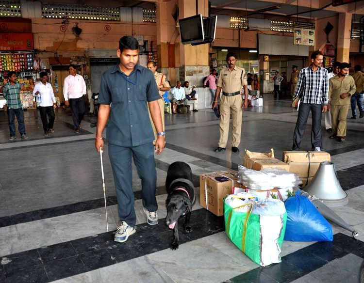Bomb Squad personnel checking Mahatma Gandhi Bus Station premises in Imlibun here on Friday with the help of sniffer dogs. Police found eight gelatin sticks from a passenger- INN Photos