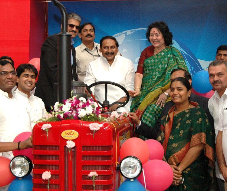 Chief Minister N Kiran Kumar Reddy along with Minister for Heavy Industry J Geeta Reddy and Mahindra & Mahindra CMD Anand Mahindra (in black suit) on a tractor at the inauguration ceremony of new Tractor Plant at Zaheerabad in Medak Dist. Minister for Women and Child Welfare Sunitha Laxma Reddy is also seen.