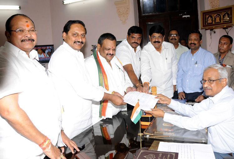 Congress MLC candidates Lakshmi Siva Kumari, Mohammed Shabbir Ali and Kolagatla Veerabhadra Swamy filing their nomination papers on Monday as Chief Minister Kiran Kumar Reddy and PCC chief Botsa Satyanarayan and other ministers looks on at Assembly secretariat.