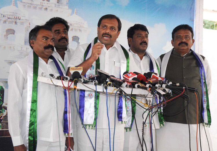 YSR Congress party MLAs speaking to press at media point in the Assembly premises on Thursday.