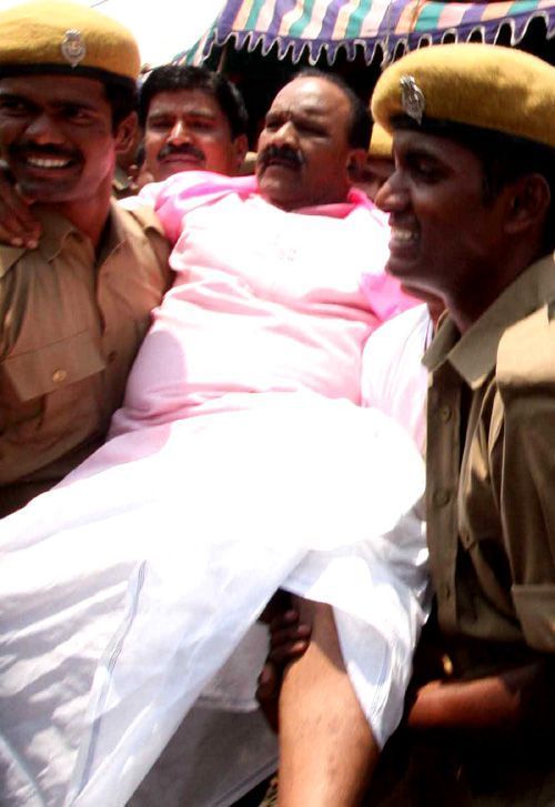 Police arrests TRS leaders and supporters who staged a protest on Banglore high way near Shamshabad as part of Sadak Bandh on Thursday. - INN PHOTO