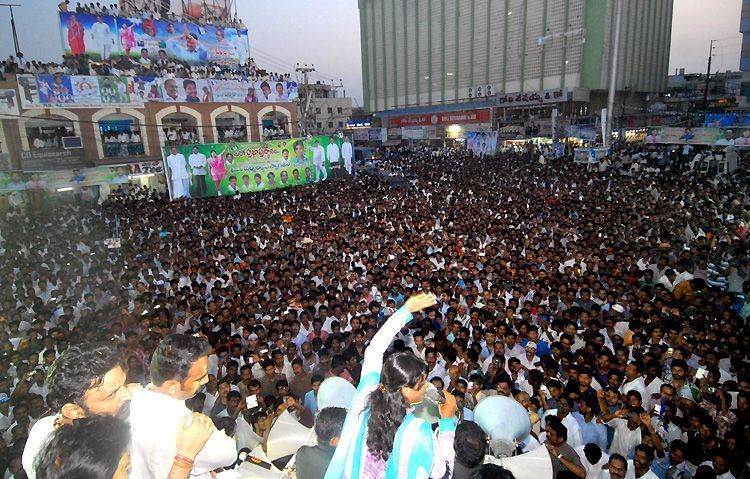 Smt. Sharmila of YSR Congress party speaking at a mammoth public meeting held at Kaleswara Rao Market in Vijayawada. Sharmila's Maro Prajaprasthanm padayatra enters Krishna dist through Prakasam barrage on Tuesday.