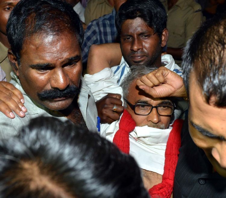 Police forcibly evicting fasting left parties leaders from Indira Park on Tuesday evening in Hyderabad