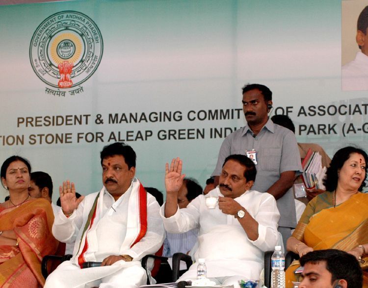 Chief Minister N.Kiran Kumar Reddy waving to the crowd during foundation stone laying ceremony for the green industrial park meant for women enterprenuers at Nandigama village in Medak district on Thursday.