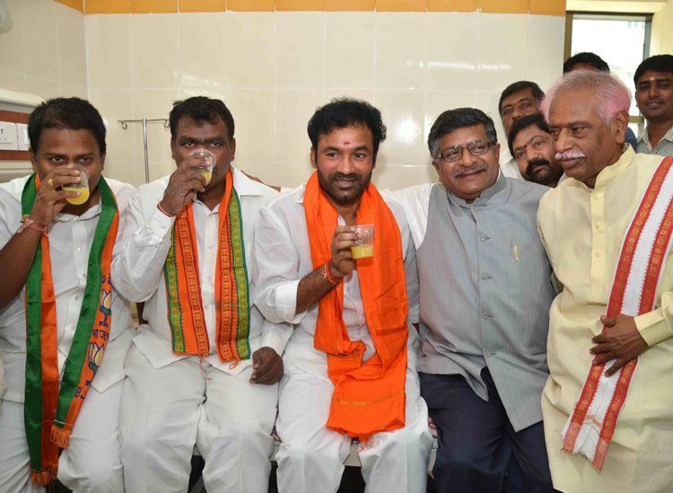 BJP senior leader Ravishanker Prasad offers lemon juice to BJP MLAs who were on indefinite fast against the power tariff hike here on Wednesday - INN Photos