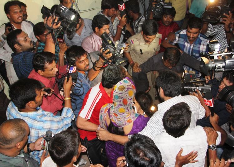Film actress Anjali talking with mediapersons after coming out of the office of the deputy commissioner of police, west zone, in Hyderabad on Friday night.