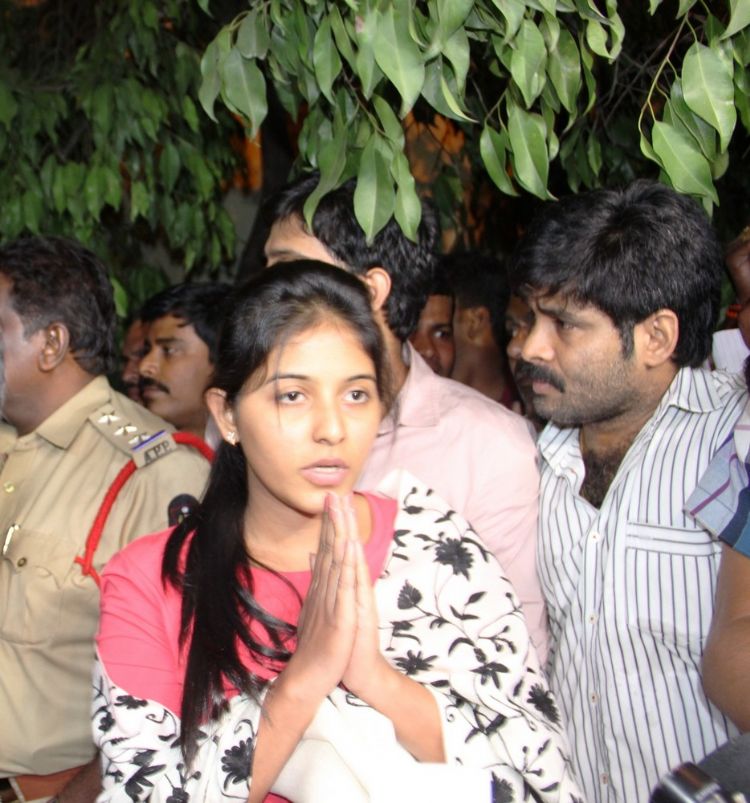 Film actress Anjali talking with mediapersons after coming out of the office of the deputy commissioner of police, west zone, in Hyderabad on Friday night.
