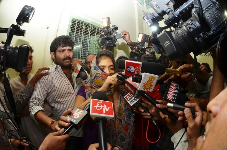 Film actress Anjali talking with mediapersons after coming out of the office of the deputy commissioner of police, west zone, in Hyderabad on Friday night.