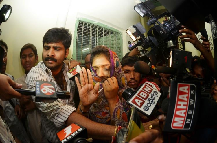 Film actress Anjali talking with mediapersons after coming out of the office of the deputy commissioner of police, west zone, in Hyderabad on Friday night.