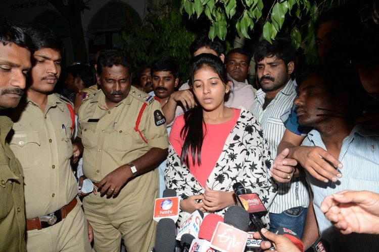 Film actress Anjali talking with mediapersons after coming out of the office of the deputy commissioner of police, west zone, in Hyderabad on Friday night.