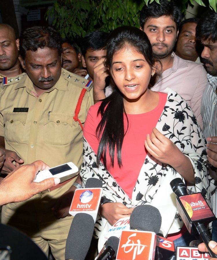 Film actress Anjali talking with mediapersons after coming out of the office of the deputy commissioner of police, west zone, in Hyderabad on Friday night.