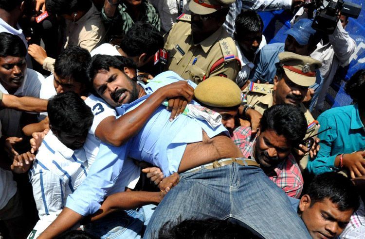 Several pro-Telangana journalists and students were injured and later arrested by the police after they opposed the release of book on United Andhra at an event organised by Visalandhra Mahasabha at Basheerbagh Press Club here on Wednesday - INN Photos
