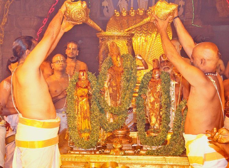 Temple priests of the famed hill shrine of Lord Venkateswara at Tirumala performed Snapana Tirumanjanam (Celestial Bath) to Processional Deities of Lord Rama, Seetha, Lakshmana, Anjaneya Swamy at Ranaganayakula Mandapam inside Sri Vari Temple in view of Sri Rama Navami on Friday.