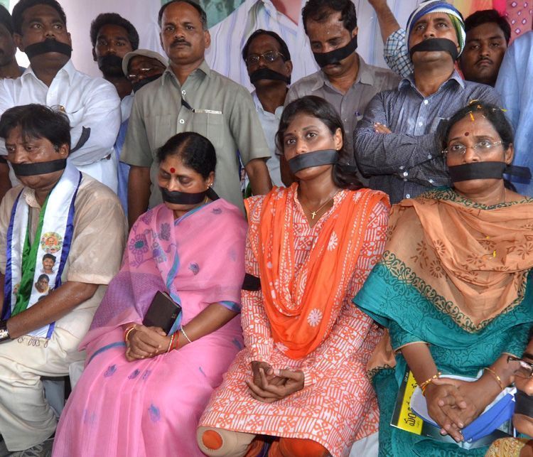YSR Congress leader Sharmila, her mother Vijayamma and other party workers stage a Mauna Deeksha, a silent protest, against the minor’s rape in Delhi, during her Padyatra programme in Anigandlapadu of Krishna district on Saturday.