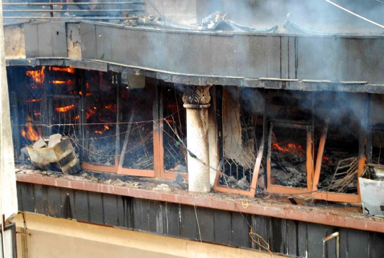 Huge fire broke out from Book Depot at near Abid Tilknager Road new Building also fully damage more then dozen firefighters vehicles control over five hors loss of property in the rupees of lakhs.
