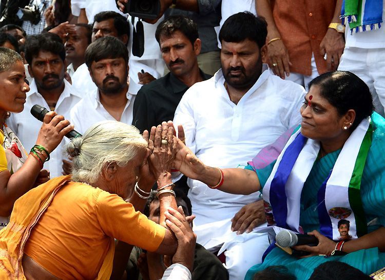 YSRCP hon. president Smt.YS Vijayamma consoles an old woman at Rachaband programme in Chevellaon Saturday.