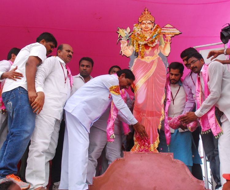 Telangana rashtirya samithi12th formation day public Meeting At Nizamabad District on 27th April TRS president K chandersheker Rao Mp touching Leg of Elder brother Kishan rao on stage.