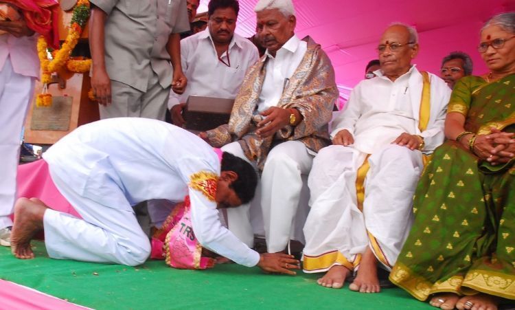 Telangana rashtirya samithi12th formation day public Meeting At Nizamabad District on 27th April TRS president K chandersheker Rao Mp touching Leg of Elder brother Kishan rao on stage.