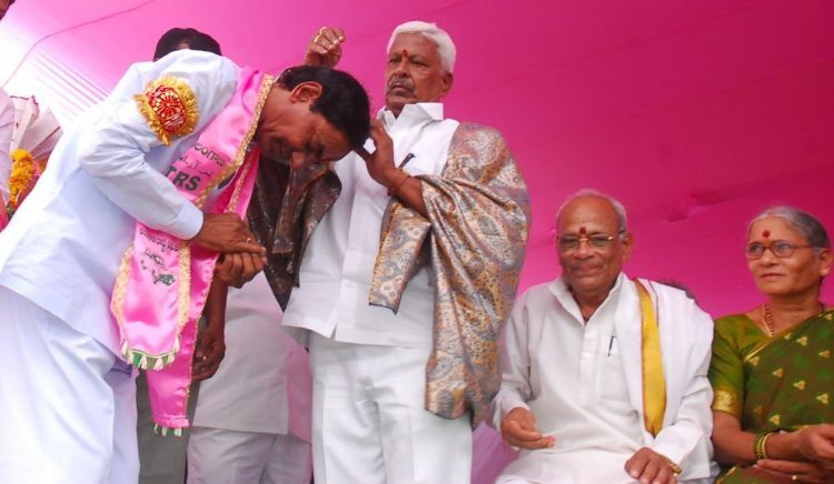 Telangana rashtirya samithi12th formation day public Meeting At Nizamabad District on 27th April TRS president K chandersheker Rao Mp touching Leg of Elder brother Kishan rao on stage.
