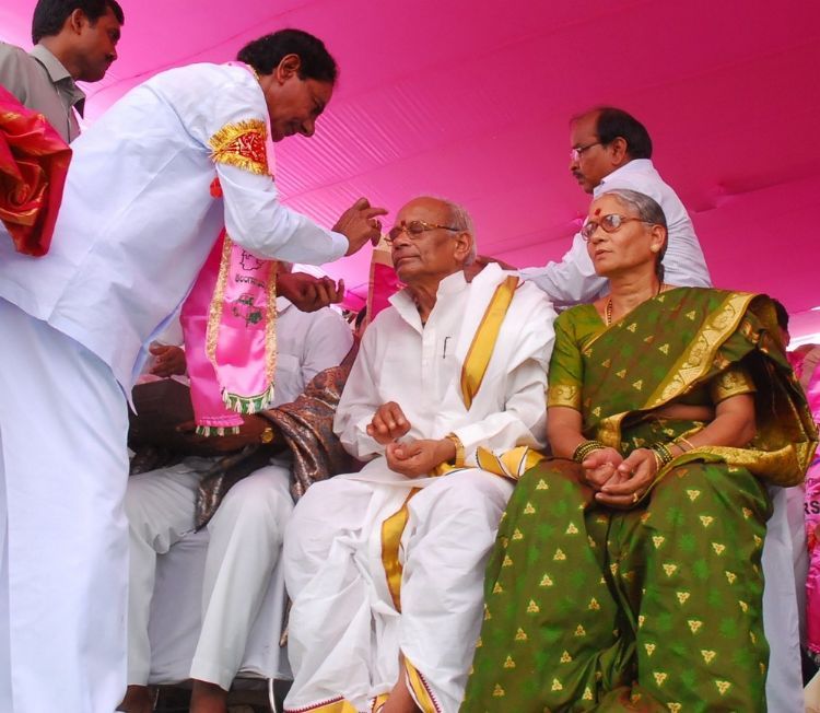 Telangana rashtirya samithi12th formation day public Meeting At Nizamabad District on 27th April TRS president K chandersheker Rao Mp touching Leg of Elder brother Kishan rao on stage.