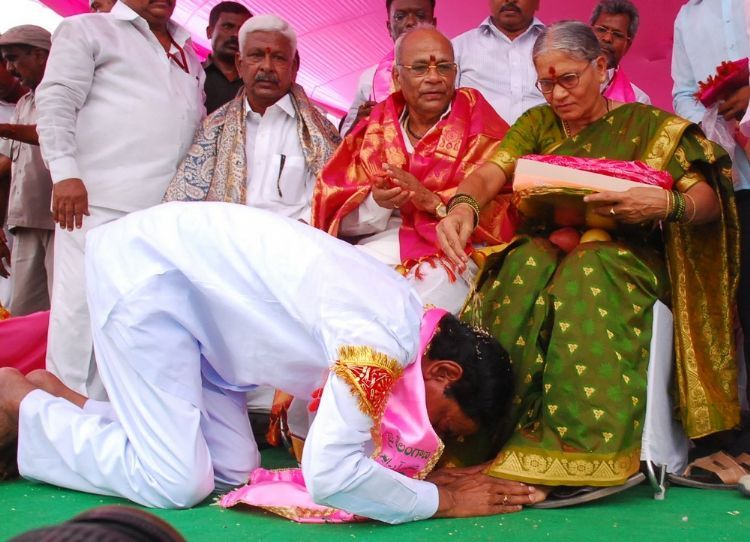 Telangana rashtirya samithi12th formation day public Meeting At Nizamabad District on 27th April TRS president K chandersheker Rao Mp touching Leg of Elder brother Kishan rao on stage.