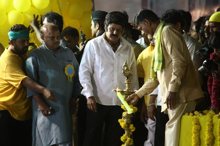 Naidu's padayatra concludes on a grand note: TDP president N.Chandrababu Naidu along with actor Balakrishna at a massive public meeting organised on the eve conclusion of marathon padayatra Vastunna Mee Kosam undertook by Naidu at Visakhapatnam on Saturday.