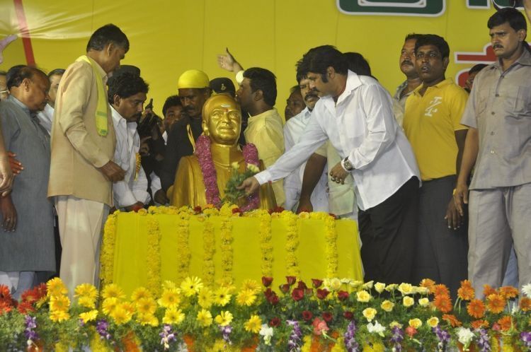 Naidu's padayatra concludes on a grand note: TDP president N.Chandrababu Naidu along with actor Balakrishna at a massive public meeting organised on the eve conclusion of marathon padayatra Vastunna Mee Kosam undertook by Naidu at Visakhapatnam on Saturday.