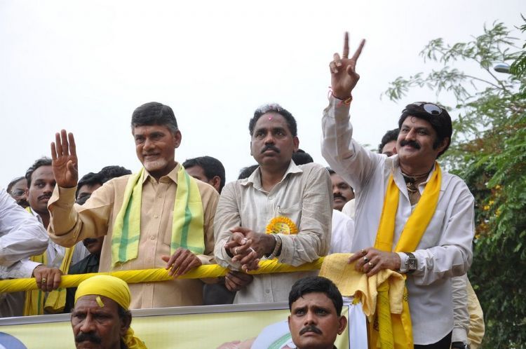 Naidu's padayatra concludes on a grand note: TDP president N.Chandrababu Naidu along with actor Balakrishna at a massive public meeting organised on the eve conclusion of marathon padayatra Vastunna Mee Kosam undertook by Naidu at Visakhapatnam on Saturday.