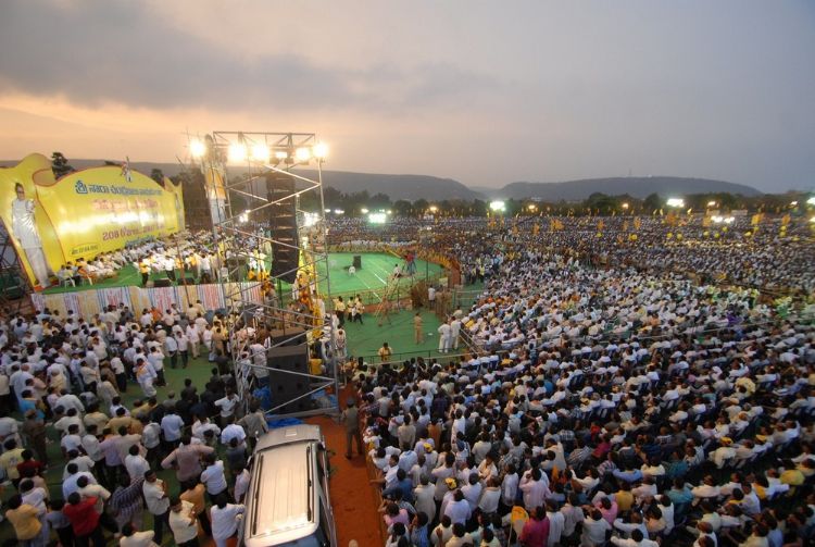 Naidu's padayatra concludes on a grand note: TDP president N.Chandrababu Naidu along with actor Balakrishna at a massive public meeting organised on the eve conclusion of marathon padayatra Vastunna Mee Kosam undertook by Naidu at Visakhapatnam on Saturday.