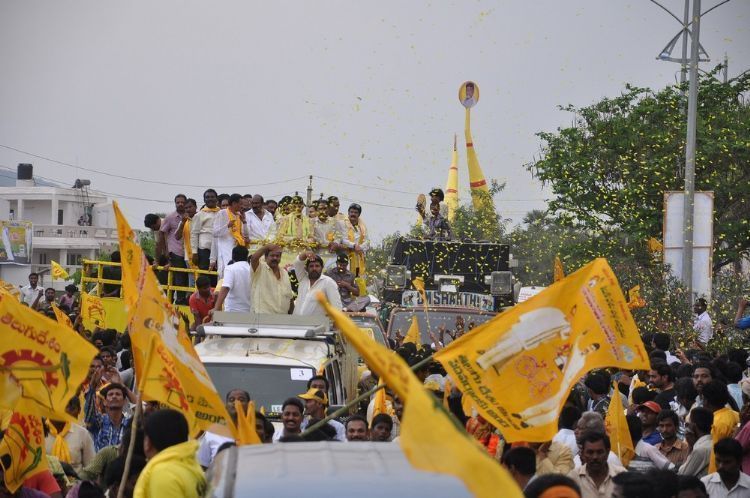 Naidu's padayatra concludes on a grand note: TDP president N.Chandrababu Naidu along with actor Balakrishna at a massive public meeting organised on the eve conclusion of marathon padayatra Vastunna Mee Kosam undertook by Naidu at Visakhapatnam on Saturday.