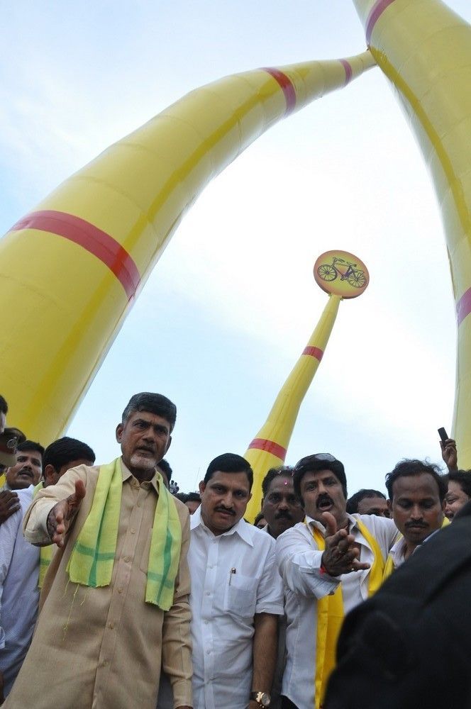 Naidu's padayatra concludes on a grand note: TDP president N.Chandrababu Naidu along with actor Balakrishna at a massive public meeting organised on the eve conclusion of marathon padayatra Vastunna Mee Kosam undertook by Naidu at Visakhapatnam on Saturday.