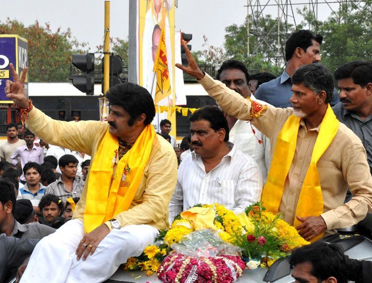 TDP Chief N Chandrababu Naidu gets a warm reception by party workers and leaders at Shamshabad Airport here on Sunday. Accompanied by actor Nandamuri Balakrishna, Naidu later taken in a grand rally to the party office - INN Photos