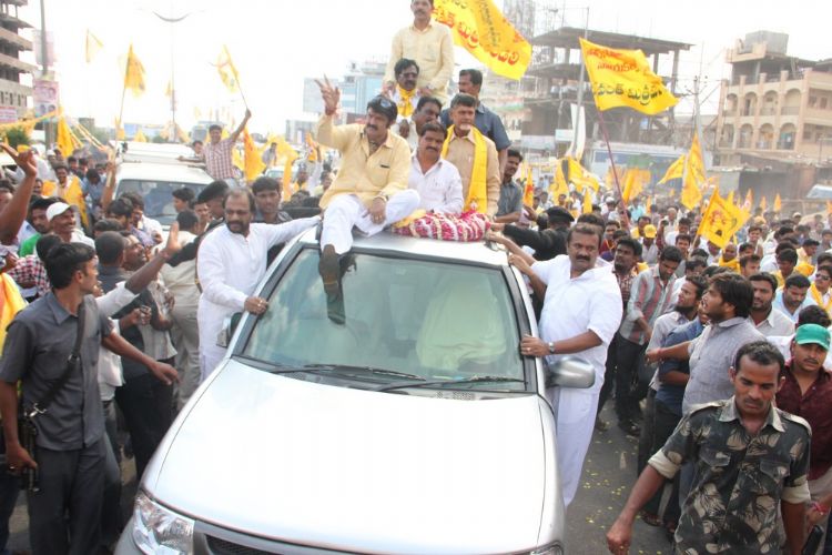 TDP president N Chandrababu Naidu being taken in a procession from the airport at Shamshabad in Hyderabad on Sunday.